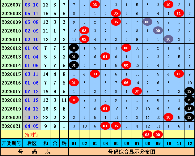 后折柳析:上期后区开出号码04和05,最近10期后区奖号奇偶比为9:11,大小比为7:13,本期后区看好号码04、05、07、08、09,后区单挑两码08、09。