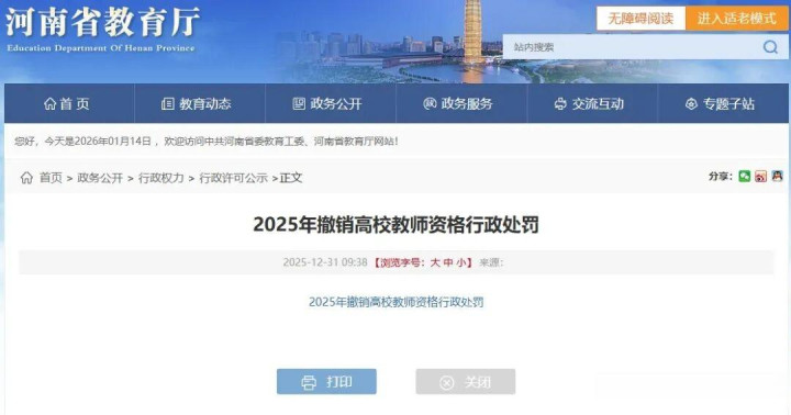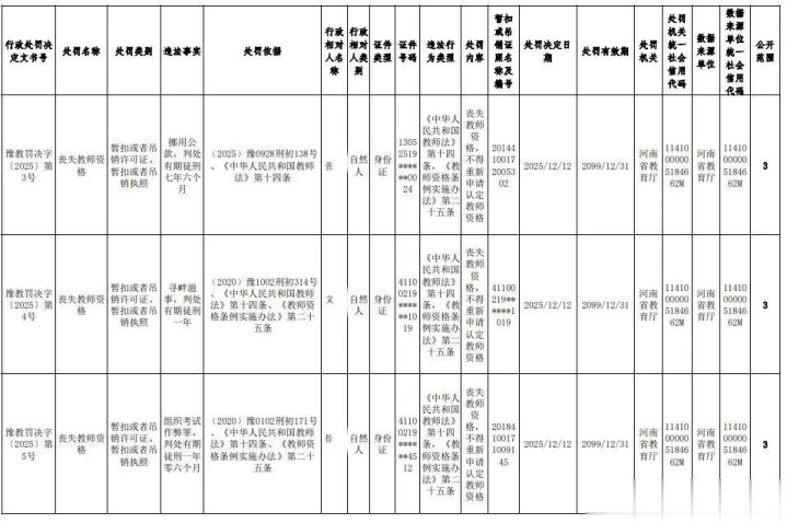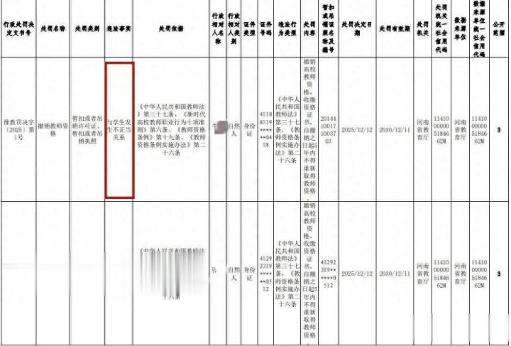 近日,河南省5名高校教师被公示丧失或撤销教师资格,其中一名高校教师与学生发生不正当关系。此事一经发布,迅速引发广泛关注。 公示内容显示,5 名教师的违法违规事实各有不同:牛某某存在与学生发生不正当关系的行为;张某某存在与女性发生不正当关系的行为;张某因挪用公款罪被判处有期徒刑 7 年 6 个月;文某某因寻衅滋事罪被判处有期徒刑 1 年;徐某某因组织考试作弊罪被判处有期徒刑 1 年 6 个月。 {jz:field.toptypename/}