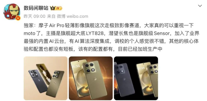 今天,这位博主的另一份消息中还提到,联想moto X70 Air Pro轻薄影像旗舰这次走极致影像赛道,主摄是旗舰超大底LYT828,潜望长焦也是旗舰级Sensor,加入了业界最强的内置AI云台,有AI算法深度集成,调校的个人感觉很不错,其他的核心体验和配置也都没有短板,凤凰彩票官网app该有的配置都有,目前已经加班生产中。