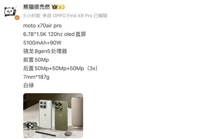 在此之前,博主@熊猫很禿然 的一份爆料中也提到了这款moto X70 Air Pro的详细信息。 按照爆料中的说法,其将配备一块6.78英寸的屏幕,1.5K 分辨率,120Hz刷新率,OLED材质;机身厚7mm,重187g,提供白色和绿色两种配色方案。核心搭载骁龙 8 Gen5 处理器,内置5100mAh电池,支持90W有线充电。影像部分,前置5000万像素自拍镜头,后置50Mp+50Mp+50Mp(3x)镜头组合。