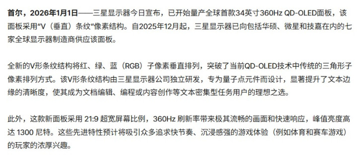 而此次三星显示在CES 2026前宣布,已量产首款采用“V‑Stripe”子像素布局的34英寸、360Hz QD‑OLED超宽面板。并向华硕(ASUS)、微星(MSI)、技嘉(Gigabyte)等七家全球显示器制造商供应该面板。所谓V‑Stripe,本质是把RGB子像素以更接近“垂直条纹”的方式进行排列,从显示的角度更贴近传统的RGB stripe,因此能明显改善桌面文字的边缘表现。