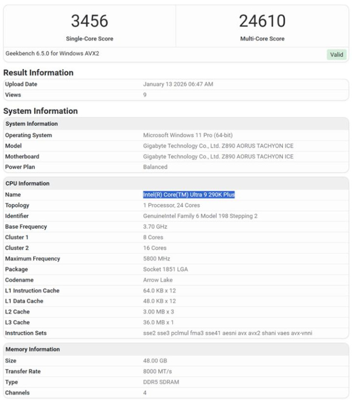 根据多家外媒收集到的消息,本次被爆出的CPU型号为Intel Core Ultra 9 290K Plus,根据榜单上的显示数据,该处理器总共为24核心,为8个P核+16个E核,在核心数量以及分布上与现有的Core Ultra 9 285K完全相同。最高频率为5.8Ghz,相比285K略高一些,由此可见290K Plus的主要提升重点还是基于频率上的。在这次测试中,290K Plus在多核上得到了24610分,单核得到了3456分;而此前的285K多核则是22580分,单核3202分。根据这个粗略结果,大致可以推测出290K Plus的多核性能大约提升9%,单核大约提升7.9%。