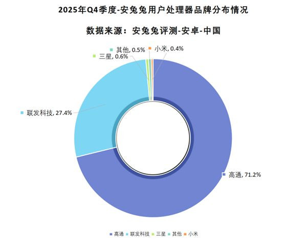 数据显示,高通以71.2%的绝对占比稳居市场头部,联发科以27.4%位居第二,而小米自研的玄戒处理器则以0.4%的份额跻身第四位。