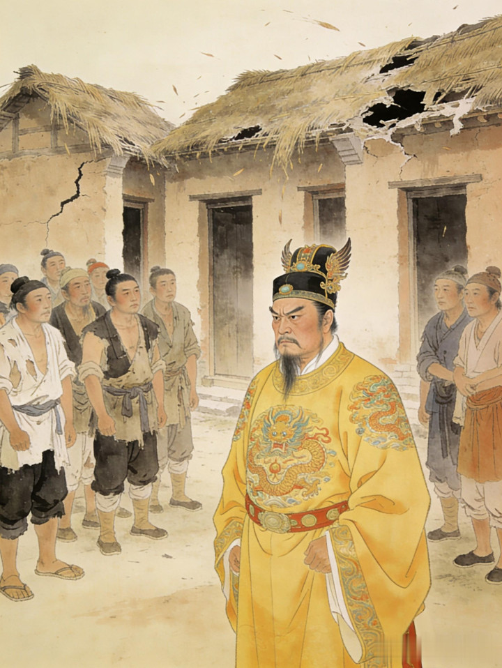 三间土坯房,墙都裂了缝,屋顶盖着茅草,风一吹就掉渣。屋里没像样的家具,只有一个破炕,一口豁了口的铁锅,墙角堆着半袋红薯——这就是全家的口粮。 王二飞的婆娘和娃,躲在门后偷偷看,手里还攥着没缝完的补丁。 朱元璋坐下时,炕沿"嘎吱"响,他赶紧扶住:"你就住这儿?" 王二飞挠挠头,递过一碗浑浊的水:"凑合住呗。前几年闹兵灾,房子被烧了,这还是乡亲们帮忙盖的。"他顿了顿,小心地问,"重八...不,陛下,您还记得不?当年咱在地主刘德家放牛,饿极了就把牛杀了,烤着吃,被刘德追着打,你把我护在身后..." 朱元璋眼睛红了。怎么能忘?那是他这辈子吃过最香的肉。后来刘德把他俩吊在树上打,王二飞替他挨了好几棍,背上至今留着疤。 "记得,"朱元璋叹口气,"那时候你说,将来要是能天天吃上白面馒头,死也值了。" 王二飞苦笑:"可不是嘛。可现在...能吃上红薯就不错了。开春的时候,县吏来收税,连种子都给抢走了,要不是陛下您去年免了濠州的税,俺们早饿死了。" 朱元璋的脸一下子沉了。他登基后明明下过令,家乡百姓免税三年,怎么还有这种事?