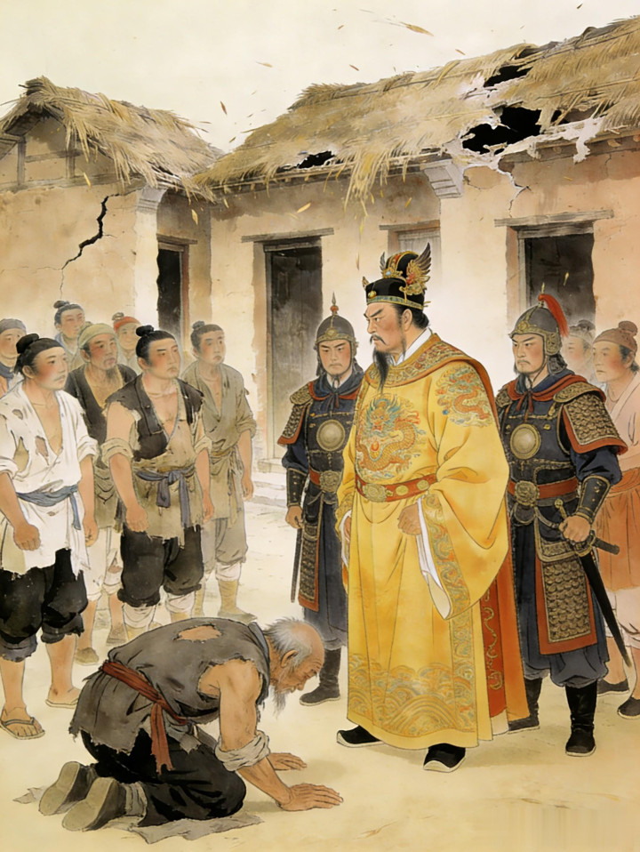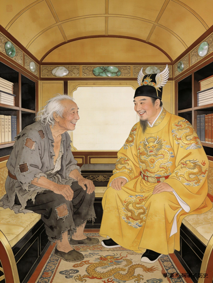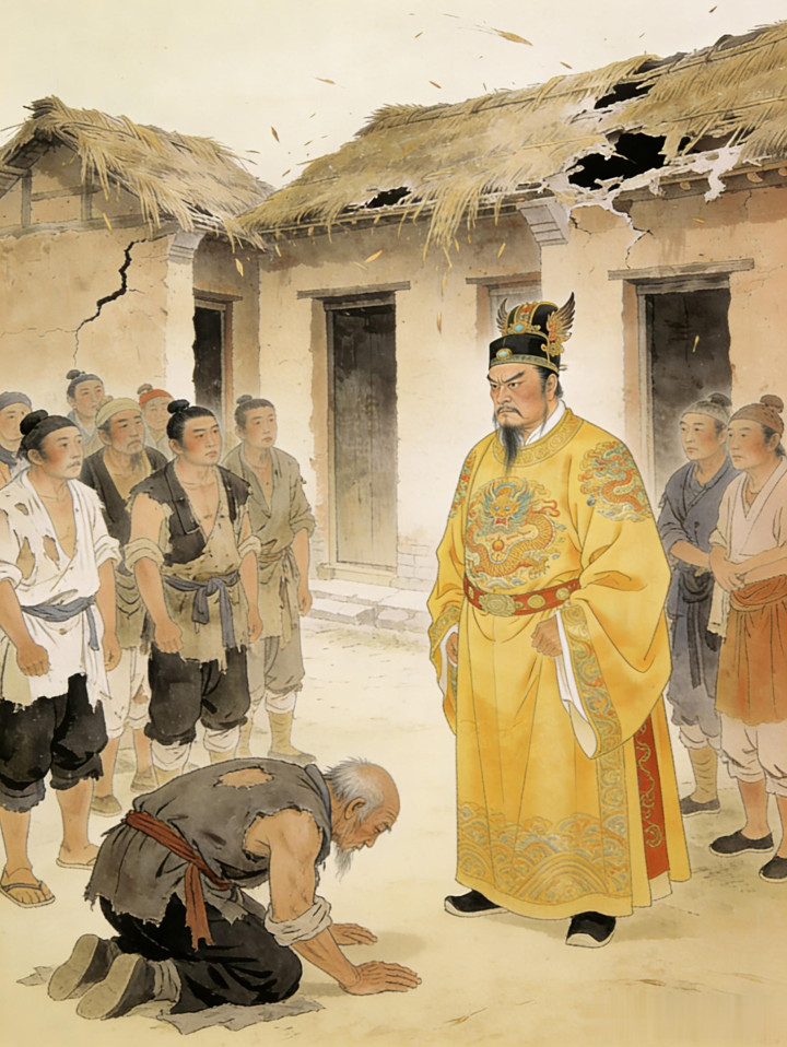 他走到王二飞面前,蹲下来仔细瞅——脸上的疤还在(当年为了抢半个窝头被地主家狗咬的),腿有点瘸(后来听说给地主扛活摔的),只是头发全白了,背驼得像座桥。 "二飞..."朱元璋的声音有点抖,"真的是你?" 王二飞这才敢抬头,看清龙袍加身的人真是当年那个瘦得像猴的朱重八,眼泪一下子涌出来:"重八...你真的当了皇帝了?" 周围的百姓吓得大气不敢出——这老汉是活腻了?敢直呼万岁的小名!可朱元璋却亲手把王二飞扶起来,拍掉他身上的土:"走,跟我回家看看。" 二、土坯房里忆当年:偷来的麦粒分着吃,如今一个龙椅一个讨饭 王二飞的家,比朱元璋想象中还惨。