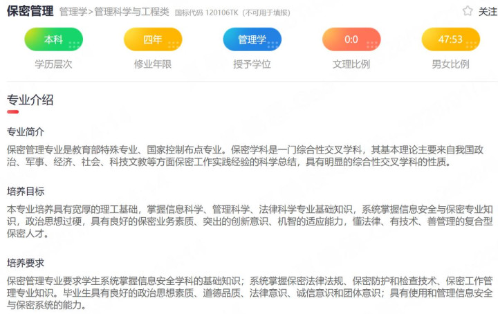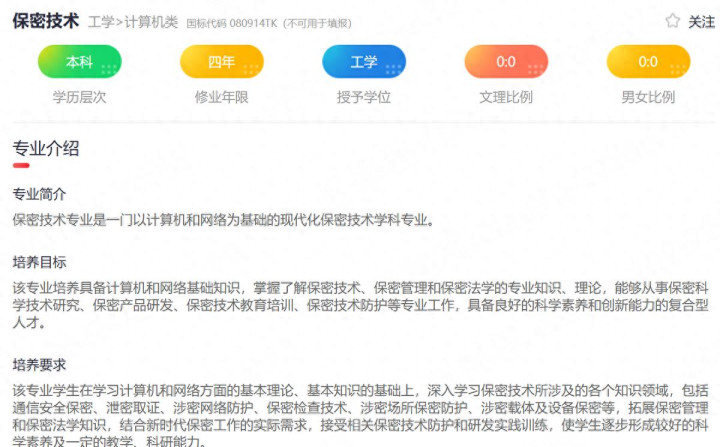 在当前激烈的就业竞争中,“稳定”成为许多家庭和学生选择专业时的重要考量。而除了大家熟知的师范、医学、警校等方向外,其实还有两个低调却极具潜力的专业——保密技术与保密管理,它们凭借与国家战略紧密对接、就业率高、岗位稳定等优势,正成为越来越多考生的“志愿优选”。 据教育部公布的数据,我国目前共有845个本科专业,其中保密技术与保密管理属于“特设控制专业”,招生规模有限,但就业表现十分亮眼。在信息化与国家安全日益重要的今天,这两个专业的人才供给仍远低于市场需求,毕业生往往“一人多岗可选”,就业质量与职业前景备受看好。 一、保密技术 保密技术隶属于工学门类,以计算机科学与网络安全为基础,融合密码学、信息学、法学等多学科,培养具备保密系统设计、安全防护、风险评估等能力的复合型人才。