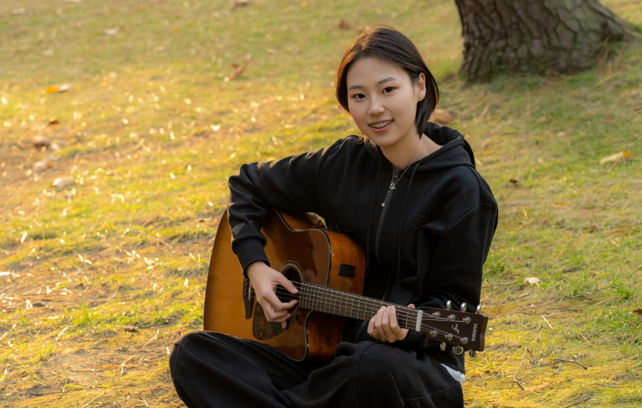 参加跆拳道比赛的李子佳 这份热爱也让我成为温暖的传递者。见刚入社的同学因怕疼不敢压腿、因动作生疏沮丧时,我总会主动示范指导,把护腿借给他们。还和队友组织“新手互助小课堂”,陪着他们一遍遍纠正动作,见证彼此的成长蜕变。 身着道服在道场坚持的每一天,帮同伴突破瓶颈时他们眼里的光,都让我深深明白:不必非要站在聚光灯中央,平凡日子里,坚守心中所爱、用力量温暖他人,就足以在自己的小天地里闪闪发光。 在弦上种花的“CC璐” 一个和弦,记录着我所有安静的时光