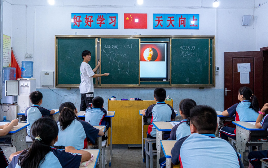 给孩子们上课的稂致远 从农村出生、在城里长大的我,总盼着能重新触摸乡土的温度,去看看偏远地区真实的发展模样。在了解到西部梦想协会“为爱黔行”支教队后,我便毫不犹豫地选择加入。 回首两年的支教路,是我一步步成长的旅程:从初出茅庐的队员到独当一面的队长,我也从贵州旺草小学孩子们口中的“狼狼”老师,变成了团队里的顶梁柱。用相机定格孩子们的每一个可爱瞬间,踩着田埂走村入户做家访,穿梭在街巷里为孩子们挑选合身的衣物……这些细碎又温暖的经历,让我慢慢懂得,支教从不是简单的知识传递,更是给孩子们种下思考未来的勇气,为他们指明前行的方向。
