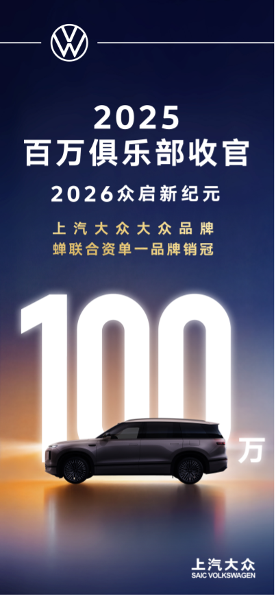 油电切换大背景下,指望一两款车的成败,就能拯救一家企业、一个品牌,已经不切实际!原因在于,热点快速迭代、用户喜好无常且竞品节奏越来越快,传统的提前预判+用户调研+产品定义的开发模式,已然失效。而当用户需求从一款产品的价值,已经转变为更宽泛且需要快速迭代的“全生命周期出行体验”。那么企业的转型,也不能仅依仗于某一两款车型的开发和市场表现,而是应立足于产品定义、技术研发、渠道运营、服务保障的全面升级,构建一套持续进化的全新体系,以不变应万变,才能立于不败,把握机遇。 而从上汽大众去年的销量表现看,能持续稳居百万俱乐部,可以说正是“全链路升级”思维模式下的产物。 百万销量基盘:源自“全链路升级”的底气 2025年,上汽大众全年终端销售106万辆,其中大众品牌2025全年零售销量超100万辆,稳居“百万俱乐部”,蝉联2025年合资单一品牌销冠。究其原因有三个核心支撑: