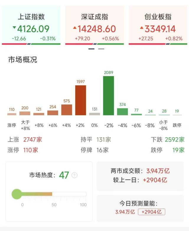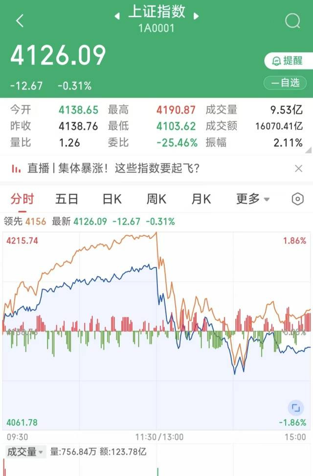 1月14日,A股市场一如既往地火热,单日成交额超3.94万亿元,连续刷新历史成交纪录。值得一提的是,这是A股首次出现连续四个交易日成交量破3万亿元的现象,证明市场活跃度空前。 不过,在连续长阳行情结束后,今天行情震荡加剧。沪指早盘高开高走,一度大涨1.24%冲上4190点,距离4200只差一步之遥。午盘两市多达4700多只个股上涨,涨停股超百只。然而,下午开盘跳水,沪指最大跌幅-0.82%,来到4103点,单日最大振幅超过2%。收盘时两市上涨个股只有2700多家,意味着2000多只个股由红翻绿。 {jz:field.toptypename/}截至收盘,沪指报4126.09点,跌0.31%,深成指涨0.56%,凤凰彩票app创业板指涨0.82%。从行业来看,互联网服务、软件开发、文化传媒、通信设备领涨,银行、保险、能源、航空等板块领跌。从概念来看,AI应用仍然是全场最靓的仔,尤其是抖音概念股,掀起涨停潮,有色板块涨势也较强,前几天狂飙的商业航天概念股连续重挫。