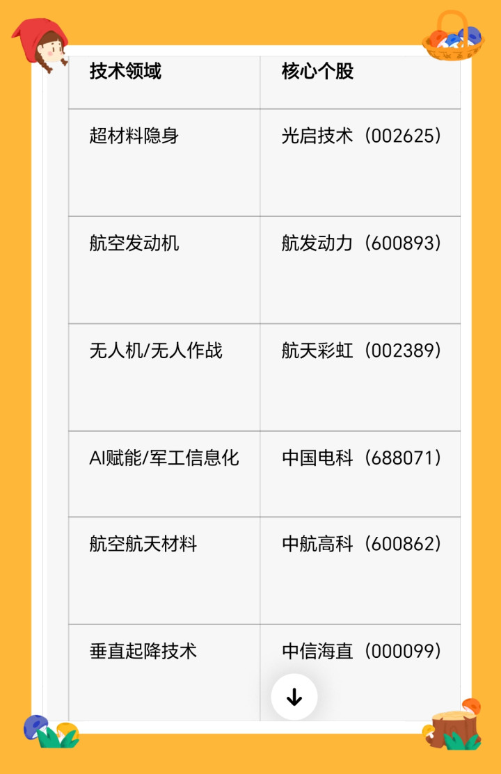 技术领域 核心个股 业务关联点 超材料隐身 光启技术(002625) 主营超材料产品,凤凰彩票在航空航天隐身领域实现产业化应用 航空发动机 航发动力(600893) 国内航空发动机龙头,覆盖军机、民机发动机研发制造 无人机/无人作战 航天彩虹(002389) 专注无人机整机及配套系统,涵盖察打一体无人机领域 AI赋能/军工信息化 中国电科(688071) 布局军工AI、无人集群协同及信息化系统研发 航空航天材料 中航高科(600862) 主营航空复合材料,为航空装备提供核心材料支持 垂直起降技术 中信海直(000099) 深耕直升机起降与运营,布局垂直起降装备配套 三、未来发展畅想与产业趋势 1. 技术落地加速:超材料、自适应发动机、AI集群协同等技术虽目前处于概念阶段,但随着军工研发投入加大,相关技术有望逐步从实验室走向产业化,推动航空航天装备升级。A股中布局核心技术的企业将率先受益于技术转化红利。 2. 产业链协同升级:空天一体作战体系的构建,将带动材料、动力、电子、AI等多领域协同发展,形成从上游材料研发到下游装备制造的完整产业链,相关细分赛道龙头企业的市场份额将进一步提升。 3. 军工科技估值重塑:“南天门计划”代表的未来空天作战理念,凸显了军工科技的战略价值,具备核心技术壁垒的企业将获得估值溢价,长线来看,军工板块的科技属性将成为估值重构的重要逻辑。 4. 军民融合拓展空间:超材料、AI、垂直起降等技术可向民用领域延伸,如民用无人机、高端材料、通用航空等领域,为相关企业打开第二增长曲线。