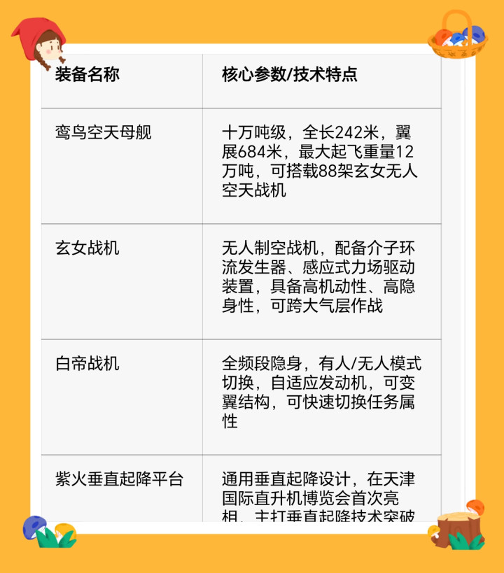 一、南天门计划核心装备技术亮点 “南天门计划”推出的装备涵盖空天母舰、多款战机及起降平台,核心技术突破集中在多个维度: {jz:field.toptypename/}装备名称 核心参数/技术特点 鸾鸟空天母舰 十万吨级,全长242米,翼展684米,最大起飞重量12万吨,可搭载88架玄女无人空天战机 玄女战机 无人制空战机,配备介子环流发生器、感应式力场驱动装置,具备高机动性、高隐身性,可跨大气层作战