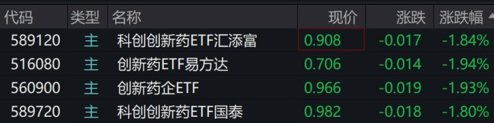 创新药概念股走低,荣昌生物跌超10%,百利天恒、信立泰、迈威生物-U跌超3%。 {jz:field.toptypename/}受盘面影响,多只创新药相关ETF跌近2%。