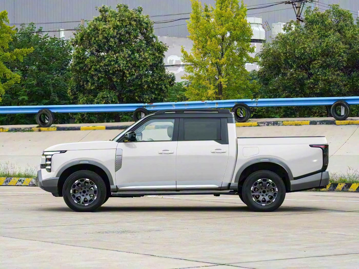 再来看车身侧面部分,车身侧面线条硬朗流畅,双色车身设计(黑色后视镜、黑色轮毂)搭配高扁平比轮胎,营造出强烈的运动感。车身尺寸方面,燃油版车型长宽高为5520×1960×1950mm,轴距3300mm;PHEV车型长宽高为5494×1960×1950mm,轴距相同。这样的尺寸设计确保了车内空间的宽敞,同时保持了硬派皮卡的姿态。车门下方的防刮饰条不仅美观,还能有效防止砂石刮擦,细节之处尽显匠心。