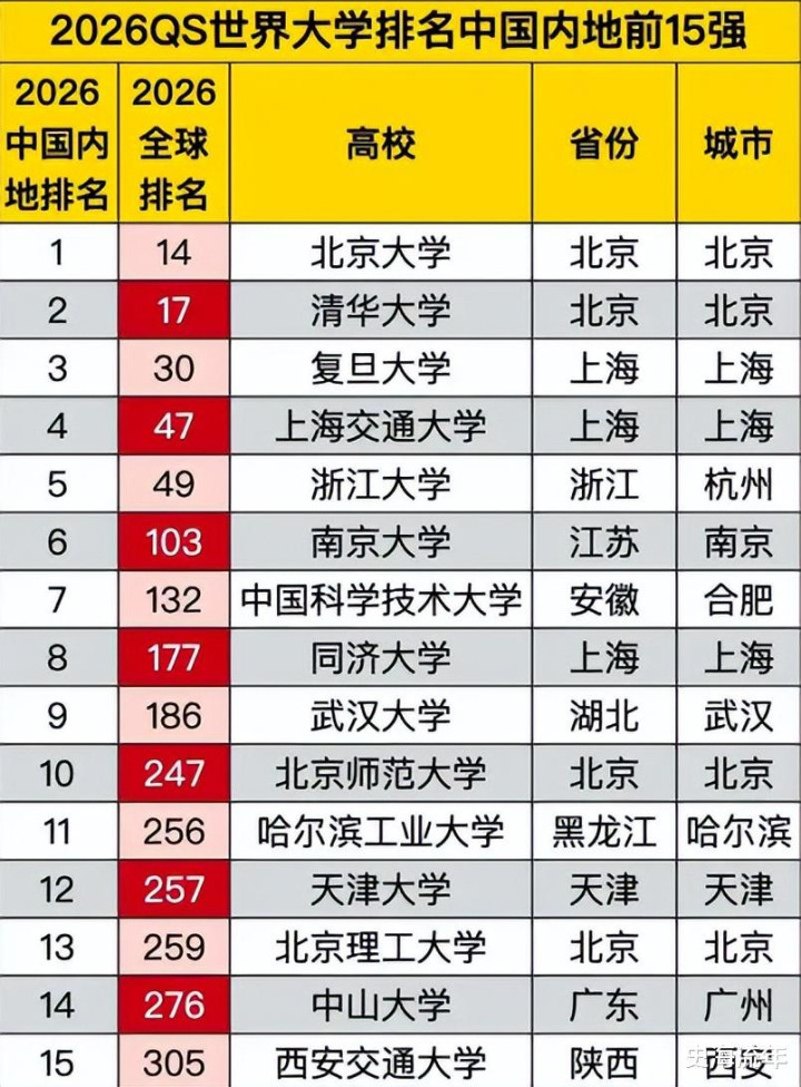 天津大学排名第257位,国内排名第十二位。北京理工大学排名第259位,国内排名第十三位。中山大学排名第276位,国内排名第十四位。西安交通大学排名第305位,国内排名第十五位。 进入《2026年QS世界大学排名中国内地高校排名》前300强的中国高校共有14所,占比约4.67%。这说明我国高等教育的规模在世界领先,但是全球高水平的高校数量还不够多。