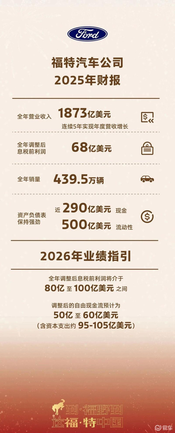 易车讯近日,福特汽车发布了2025年财报数据。证实官方公布的良友表露,福特2025年全年交易收入1873亿好意思元,蚁合五年竣事年度营收增长,凤凰彩票全年转化后息税前利润68亿好意思元。
