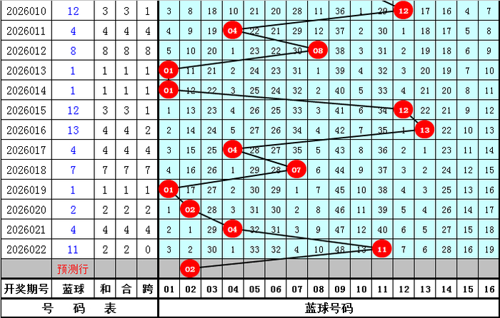 蓝球推选:最近10期蓝球开出余数:1出现4次,2、4出现2次,3、7出现1次,0、5、6、8、9出现0次,本期蓝球看好开出偶数号码,关爱蓝球02。