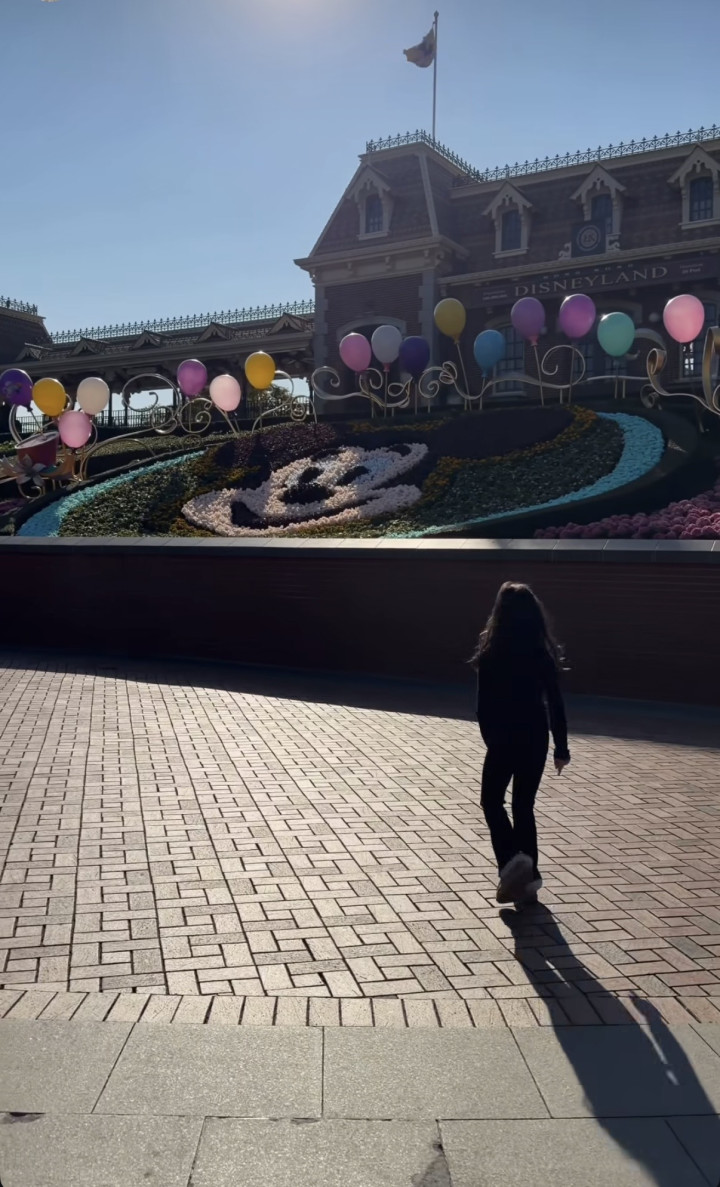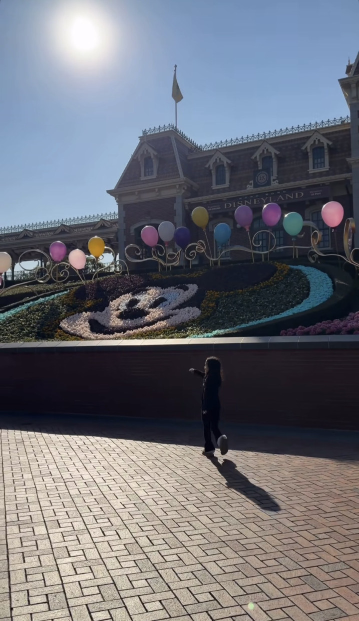 6岁的Sara对主题乐园一直很有兴趣,她在有米奇头像的花圃留影,谢婷婷忙着“指挥”拍照。谢婷婷惯例没有晒出女儿的正脸照,只有背影,只见6岁的Sara留着一头黑色的长发,年纪虽然不大,但是身高在同龄人中显得颇为挺拔,特别是因为穿了较为修身的衣裤,就更显得出众。谢婷婷一家出游的当日,大概不是周末,而且去的时间应该比较早,所以园内似乎没有什么游客,偌大的广场就只有谢婷婷一家人,也是相当难得。