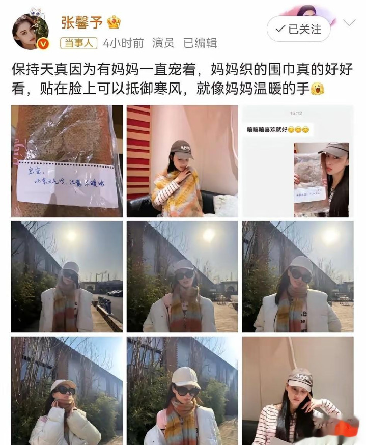 除了张凌赫的妈妈会给他织毛衣在,张馨予同样也收到了来自妈妈钩织的围巾,都是全世界独一无二的妈妈的爱,张馨予还连续用九宫格晒出了自己和妈妈相处的日常。